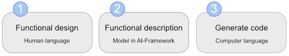 With the AI-Framework, the functional design is described as a model (step 2). The painstaking coding is done by the AI-Framework (step 3).